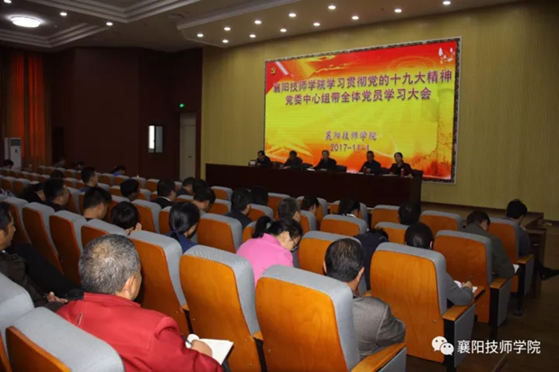 招生就业:0710-3622593为了进一步宣传、贯彻、落实党的十九大精神,11月1日下午3时,学院组织召开了党委中心组带全体党员学习大会。会议由党委书记李中林主持。副院长冯德学、王襄生、彭铁山、赵兰以及全体党员参加了会议。