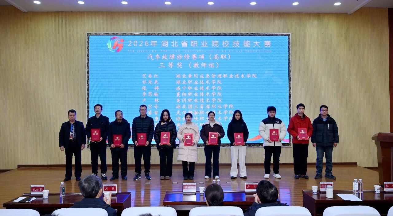 招生就业:0710-36225931月15日上午,2026年湖北省职业院校技能大赛汽车故障检修赛项(高职组)闭幕式在我校举行。来自全省各职业院校的领队、裁判、指导教师及参赛师生代表齐聚一堂,共同见证此项赛事的圆满收官。