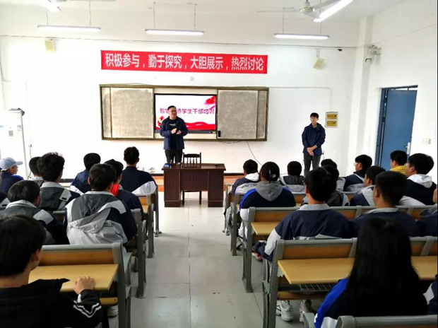 机械工程系党总支书记张几峰以“如何成为一名优秀的学生干部”为主题,从学生干部的职责、学生干部应该怎样做等方面展开,要求学生干部们尽快适应环境,学会全面思考,有大局意识;要主动为班级、同学着想,有服务意识;要积极为老师分担工作,有担当意识;最后还强调了学生干部遵循这些要求的必要性和重要性。